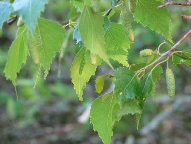 COMMON FEATURES: The buds are sharp and thick and sometimes grow on short stems. The flower bud is the winter catkin. In the spring these buds elongate to become the flowering catkin. They all have simple ovate leaves with sharp toothed leaf margins and pointy tips. The delicate stems and leaves all seem to shimmer and flutter with the wind, this characteristic of all the birches. The bark displays its classic horizontal lenticels or disconnected stripes.